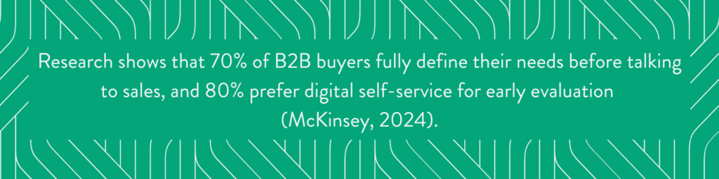Industrial buyers are rewriting the playbook. Research shows that 70% of B2B buyers fully define their needs before talking to sales, and 80% prefer digital self-service for early evaluation (McKinsey, 2024). For lower mid-market industrial companies, this shift isn’t just following a trend set by B2C or SaaS – it’s now a core value creation imperative.